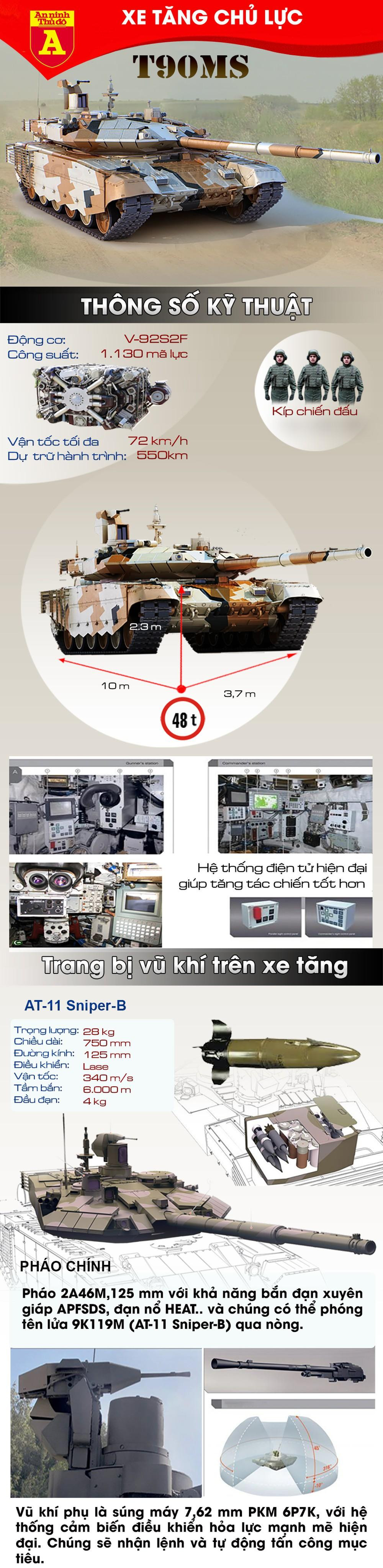 T90MS là bản nâng cấp mới nhất của dòng xe tăng chủ lực T90. Phiên bản "MS" có khả năng bảo vệ tốt hơn, tăng tính cơ động và cải thiện hệ thống điện tử. Điểm khác biệt đáng chú ý nhất là tháp pháo mở rộng giúp tăng góc quan sát cho xạ thủ.