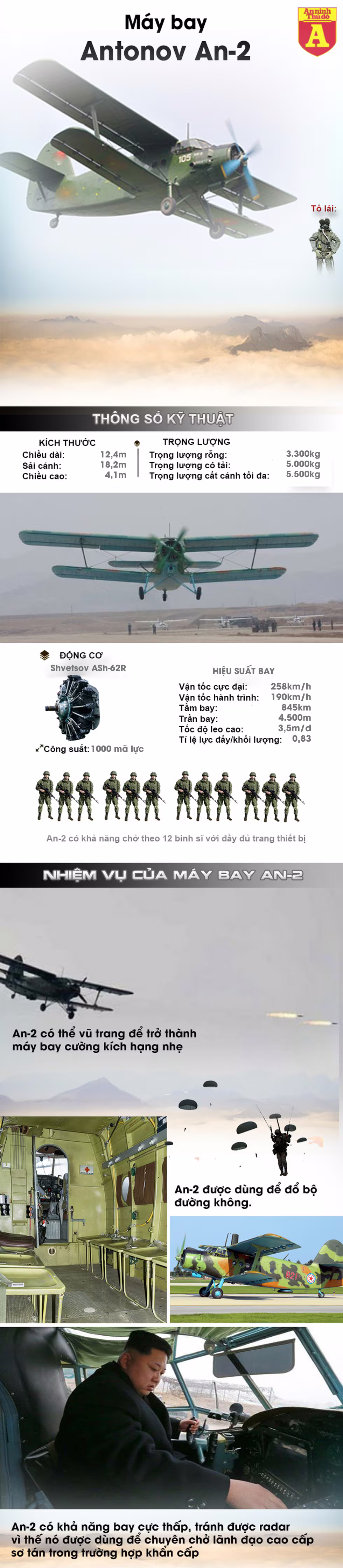 Máy bay hai tầng cánh Antonov An-2 của Liên Xô có kiểu dáng thiết kế lạc hậu và vận tốc chậm chạp nhưng chính yếu tố này đang được Triều Tiên khai thác triệt để trong các chiến dịch quân sự. Hiện Triều Tiên đã tự sản xuất được loại máy bay này.