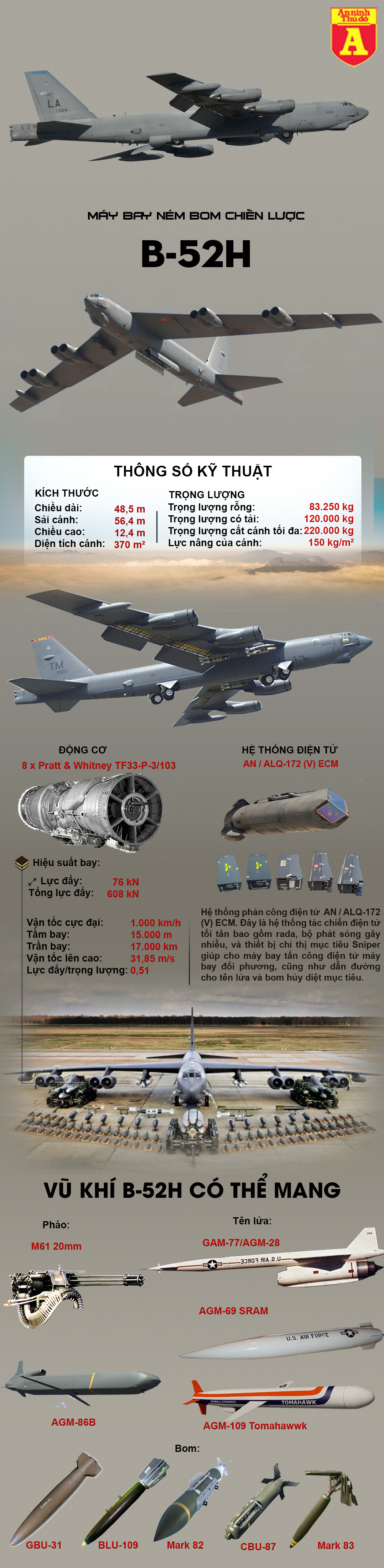 “Điều này đồng nghĩa máy bay B-52 có thể chở thêm 66% lượng bom so với phiên bản cũ. Con số tăng thêm này là cực kì lớn. Hãy thử tưởng tượng bạn có thể tấn công được nhiều lần hơn trước mà chỉ cần một lần xuất kích”, Không quân Mỹ tuyên bố. Với gói nâng cấp mới nhất tải trọng vũ khí của một chiếc B-52H sẽ đạt tới gần 50 tấn bỏ xa đối thủ nặng ký nhất tới từ Nga loại máy bay Tu-160 (40 tấn).