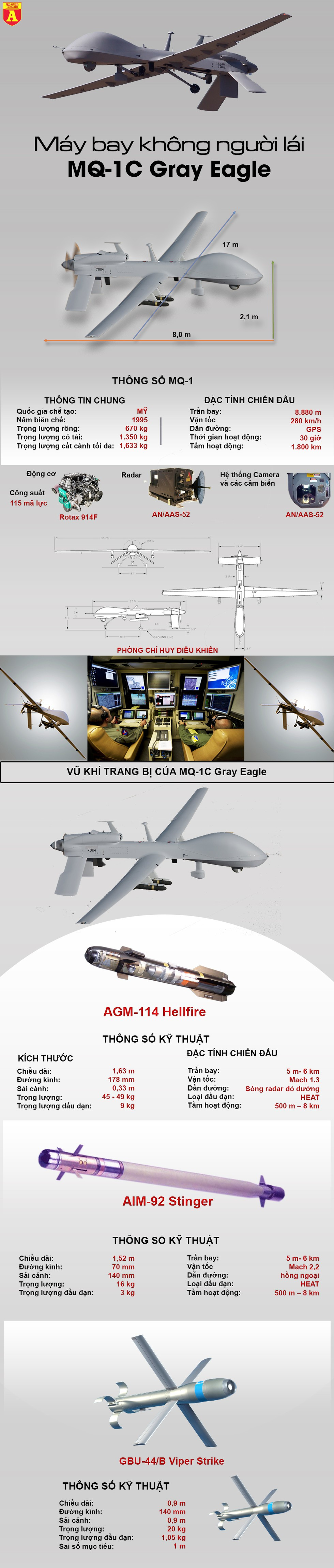 MQ-1C Gray Eagle là máy bay trinh sát không người lái kiêm tấn công của không quân Mỹ. Với thời gian bay liên tục lên tới 30 giờ cùng khả năng mang theo các tên lửa đối không hoặc đối đất với tổng trọng lượng vũ khí lên tới 553kg, MQ-1C là cơn ác mộng trên không đối với lục quân đối phương.