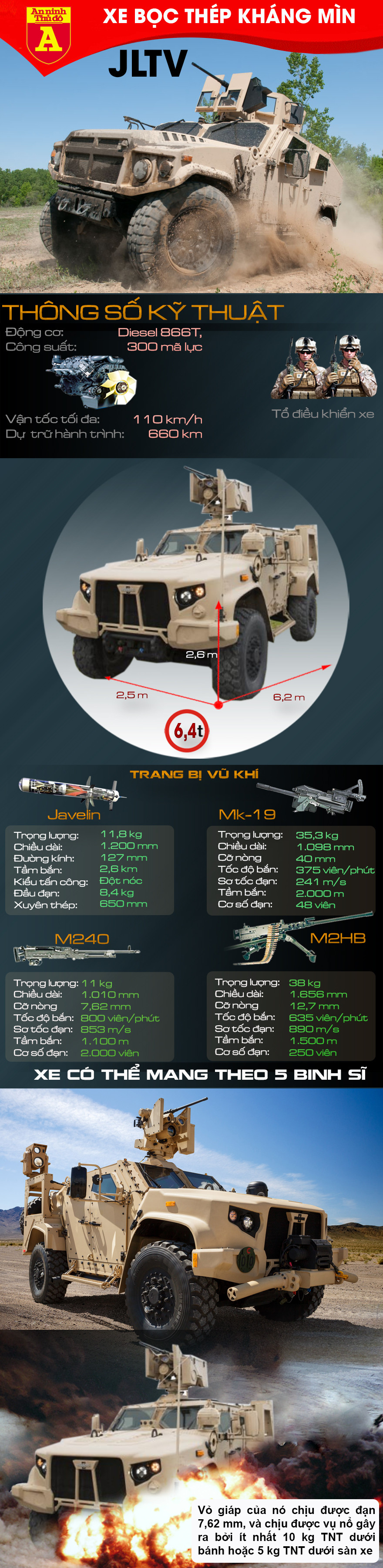 Xe bọc thép kháng mìn JLTV ra đời nhằm thay thế cho dòng xe thiết giáp huyền thoại Humvee đã hoạt động trong lục quân Mỹ từ thập niên 1980. JLTV mới được quân đội Mỹ trang bị hàng loạt từ giữa năm 2017. So với dòng xe Humvee, xe thiết giáp kháng mìn JLTV hoạt động tốt hơn, có trọng lượng lớn hơn, khả năng bọc giáp tốt hơn để có thể chống lại các loại đạn súng trường và chịu được sức công phá từ các loại mìn cũng như mảnh văng đạn pháo.