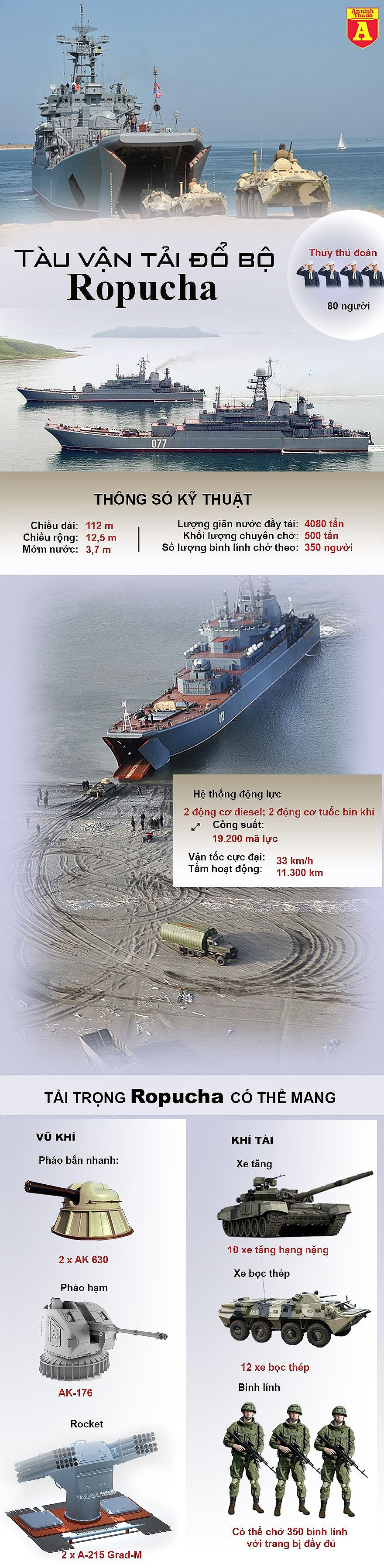 Ropucha là lớp tàu đổ bộ cỡ lớn trong biên chế hải quân Nga, với khả năng chuyên trở 500 tấn hàng hóa, phương tiện chiến tranh và binh sĩ. Do cả phần mũi và đuôi tàu đều có thể đóng mở nên cơ chế nạp và dỡ hàng hóa diễn ra rất linh hoạt. Loại tàu này có diện tích sàn chứa lên tới 630 m2 giúp nó có thể chuyên chở tới 25 xe bọc thép cùng một số lượng lớn binh lính hay 10 xe tăng chiến đấu hạng nặng với 350 quân nhân, hoặc chuyên chở các hệ thống phòng không đánh chặn.