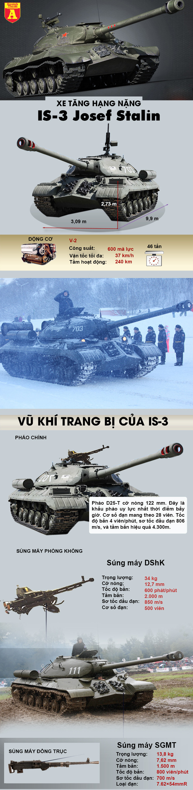 Tuy được coi là đối thủ đáng gờm nhất của các loại xe tăng trong Thế chiến thứ 2, nhưng IS-3 lại không kịp tham gia vào chiến trận, bởi chiến tranh đã kết thúc trước khi chúng được đưa vào biên chế. Xe tăng hạng nặng IS-3 được sản xuất hàng loạt cho đến giữa năm 1946 với 2.311 chiếc được sản xuất. Hiện Nga vẫn còn giữ được một số chiếc ở tình trạng tốt và chúng sẽ tái xuất trong lễ duyệt binh kỷ niệm 100 năm ngày thành lập Hồng quân Liên Xô tới đây.