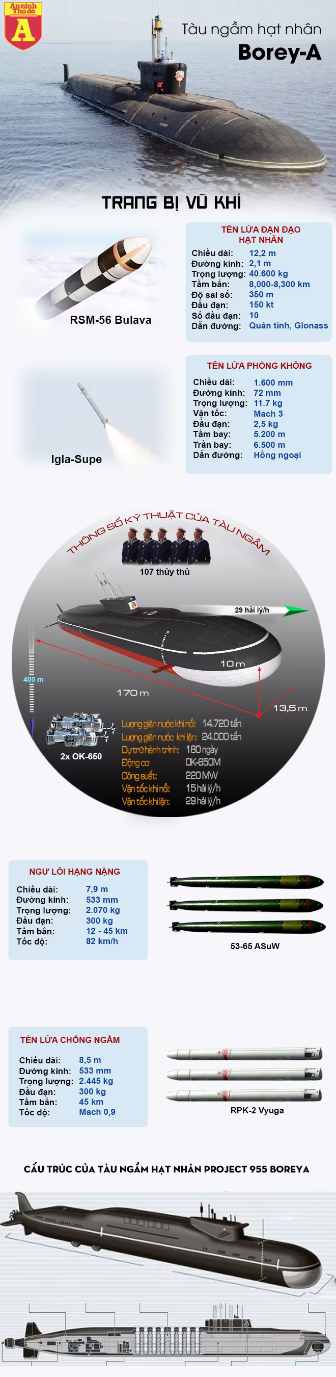 Về trang bị vũ khí, tàu ngầm nguyên tử Borey-A mang theo 16 tên lửa đạn đạo liên lục địa (SLBM) RSM-56 Bulava. Mỗi tên lửa có thể chứa tới 10 đầu đạn hạt nhân có đương lượng nổ từ 150 kiloton. Với tổng đương lượng nổ lên tới 24.000 kt, một đòn tấn công của Borey-A có thể hủy diệt cả một quốc gia chỉ trong tích tắc.