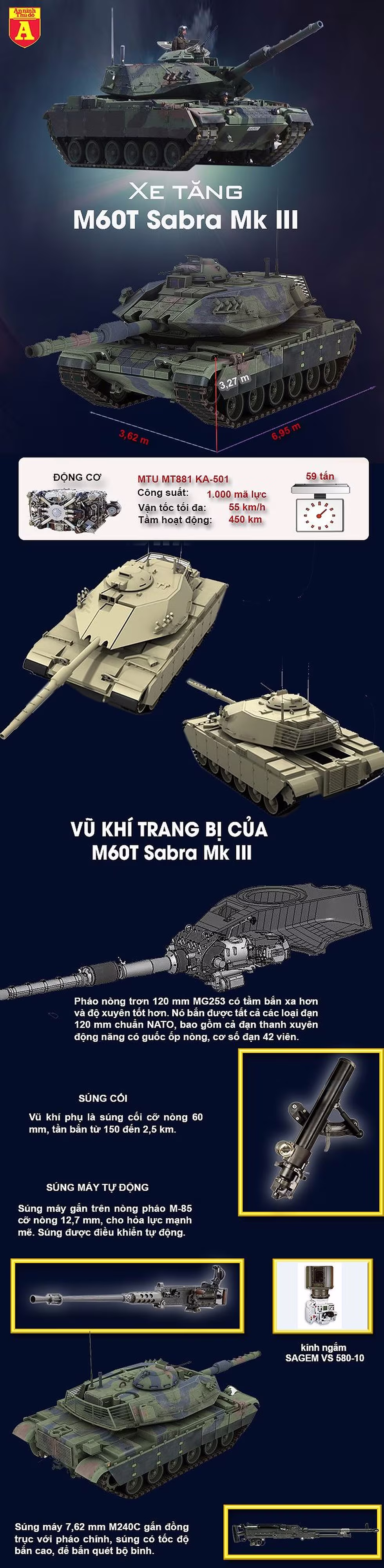 M60T Sabra Mk III chính là phiên bản M60 của Mỹ được Israel hiện đại hóa cho lục quân Thổ Nhĩ Kỳ. Dưới "bàn tay ma thuật" của Israel, loại xe tăng này từng khiến sát thủ diệt xe tăng Kornet của Nga phải thúc thủ.
