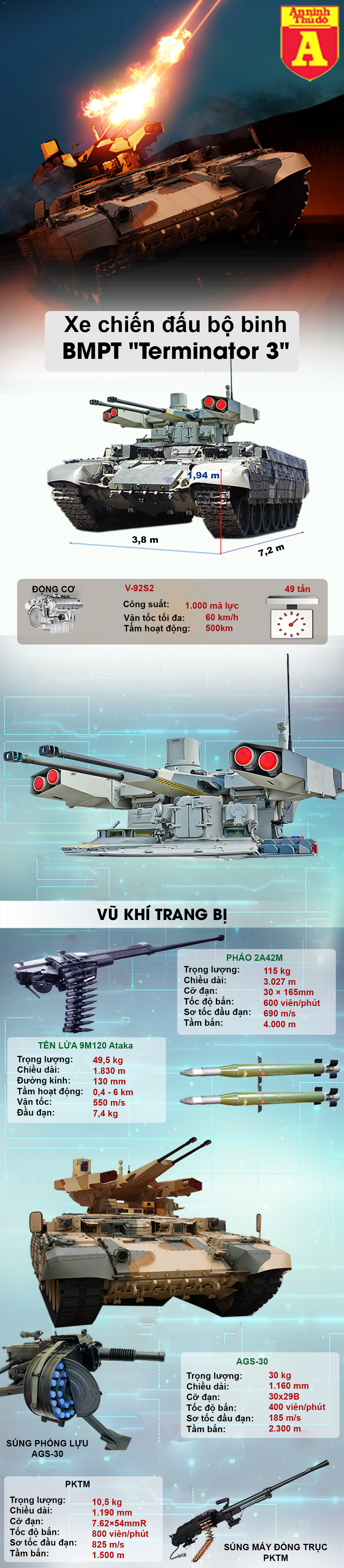 BMPT được trang bị dàn hỏa lực cực mạnh gồm 2 pháo tự động 2A42 30 mm, 4 tên lửa chống tăng 9M120 Ataka, 2 súng phóng lựu AG-17D 30 mm và 1 súng máy 7,62 mm. Dàn vũ khí mạnh mẽ này có thể tiêu diệt từ binh lính cho đến xe tăng, giúp tạo nên biệt danh "Kẻ hủy diệt" cho BMPT.