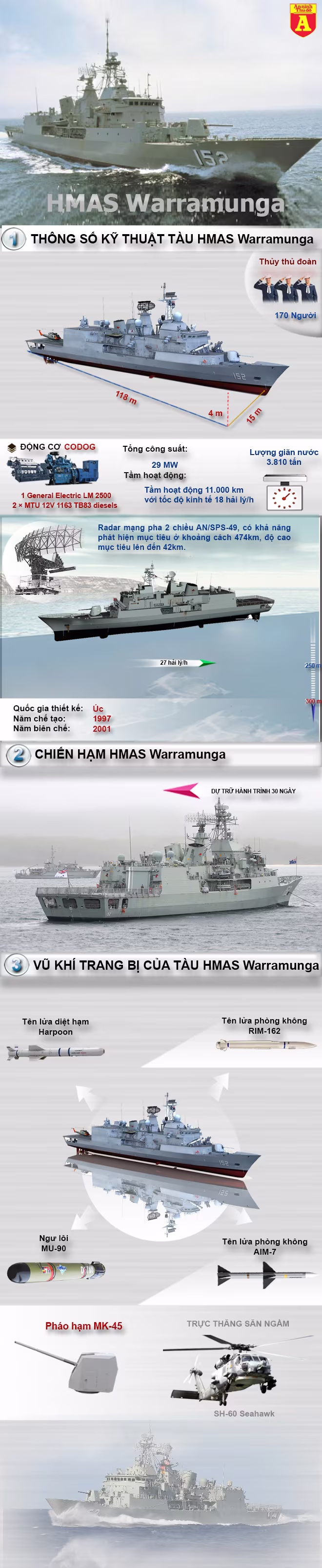 HMAS Warramunga được đóng mới vào năm 1997 và đã thực hiện nhiệm vụ đầu tiên của mình vào năm 2001. Tàu có trọng tải 3.810 tấn, chiều dài 118, chiều rộng 15, mớn nướn 4m, trang bị hệ thống điện tử và vũ khí rất hiện đại, chúng có thể công thủ toàn diện trước các mối đe dọa tấn công từ trên không, mặt biển, và cả dưới lòng đại dương.