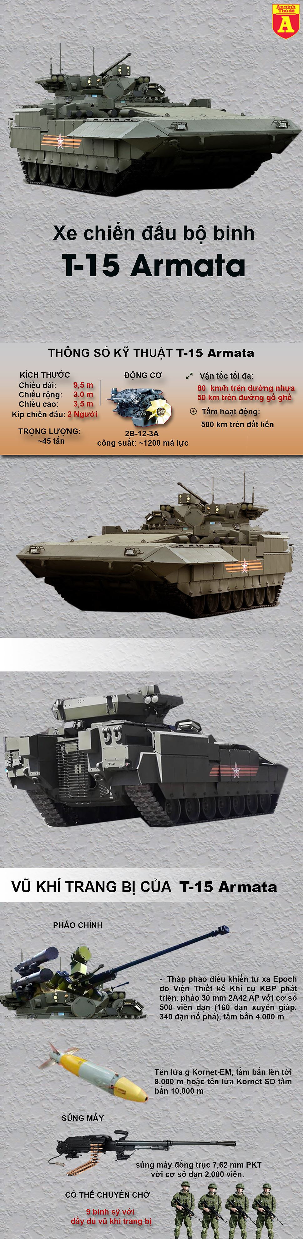 T-15 Armata là sự kết hợp đặc điểm của hai loại xe quân sự — xe chiến đấu bộ binh và xe bọc thép hạng nặng ra mắt vào năm 2015. T-15 Armata có cấp độ xe tăng giáp bảo vệ, trọng lượng chiến đấu là 45 tấn, nhưng lại có thể tăng tốc tới 70 km/h, vượt BMP "Bradley" tốc độ cao của Mỹ, tuy loại này chỉ nặng khoảng 30 tấn. Ngoài ra, T-15 Armata được trang bị một trong những hệ thống chống tên lửa "Kornet" mạnh nhất trên thế giới. Xe chiến đấu bộ binh T-15 Armata được trang bị các hệ thống bảo vệ kết hợp, bổ sung giáp phản ứng nổ kép Malachit và hệ thống phòng thủ chủ động Afghanit, hệ thống bảo vệ quang - điện tử và một tổ hợp chế áp tín hiệu radio.