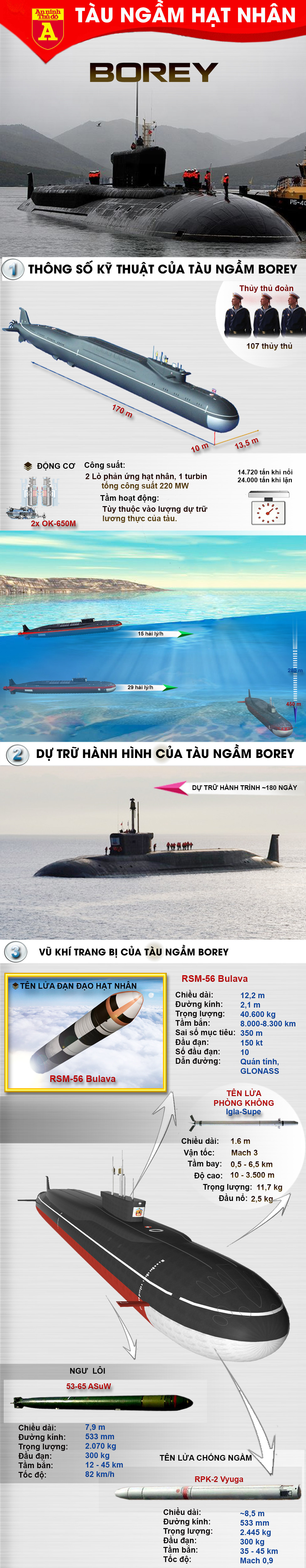Borey là lớp tàu ngầm hạt nhân chiến lược mới nhất gia nhập hạm đội tàu ngầm Nga, kể từ khi Chiến tranh Lạnh kết thúc. Với lượng giãn nước khi lặn lên tới 24 ngàn tấn, Borey mang theo 107 thủy thủ và có dự trữ hành trình lên tới 180 ngày. Siêu tàu ngầm này có hai lò phản ứng hạt nhân OK-650M với khả năng hoạt động không giới hạn mỗi khi được tiếp liệu đầy đủ, nhờ đó tàu có thể vận hành ở vận tốc lên tới 29 hải lý/giờ khi lặn.