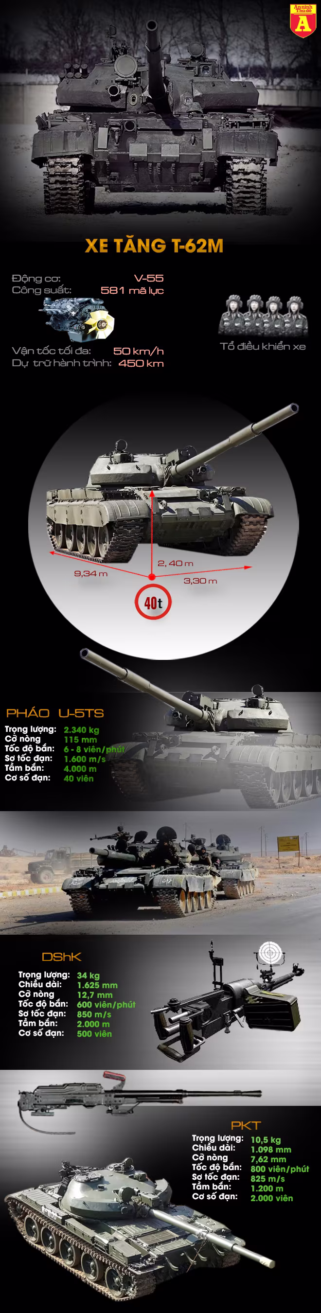 T-62M là biến thể nâng cấp hiện đại của xe tăng T-62 của Nga. Bị đánh giá thua kém T-72, T-90, tuy nhiên khi tham chiến tại Syria, chiếc T-62M của quân đội Syria đã thể hiện xuất sắc khi đã bảo vệ kíp lái an toàn và vẫn đứng vững không bị phá hủy ngay cả khi trúng tên lửa chống tăng TOW do Mỹ sản xuất.