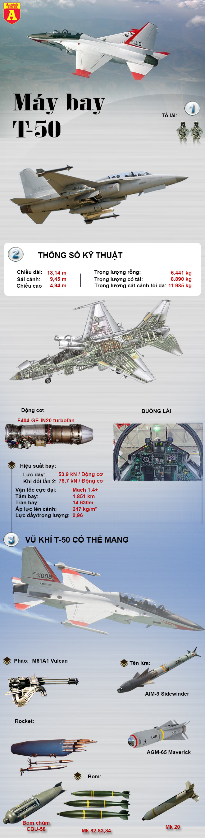 T-50 là máy bay thế hệ thứ tư của Hàn Quốc. T-50 có tính năng rất tuyệt vời. Máy bay này áp dụng công nghệ ổn định có thể nâng cao khả năng cơ động, hệ thống kiểm soát số hóa có thể điều khiển bay chính xác, thiết bị cảm biến tấn công tự chủ tiên tiến có thể đồng thời tập trung vào nhiều mục tiêu…