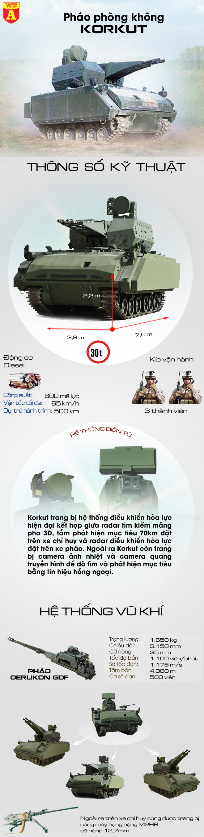 Hỏa lực của xe là hai pháo phòng không cỡ nòng 35mm cho tốc độ bắn 1.100 phát/phút. Tầm bắn đạt 4.000m, ngoài ra trên xe chỉ huy trang bị súng máy hạng nặng M2HB cỡ nòng 12,7mm. Korkut đã có trận thực chiến hồi tháng 10-2016 vừa qua, triệt hạ những quả rocket bắn bởi khủng bố IS. Hiện nay Thổ Nhĩ Kỳ tiếp tục điều hệ thống này sang chiến trường Syria vì lo ngại máy bay hoặc đạn rocket từ đối phương có thể bắn thẳng vào đội hình của quân đội nước này vốn đang thực hiện chiến dịch "Cành ô liu" nhằm vào lực lượng dân quân người Kurd tại Syria.