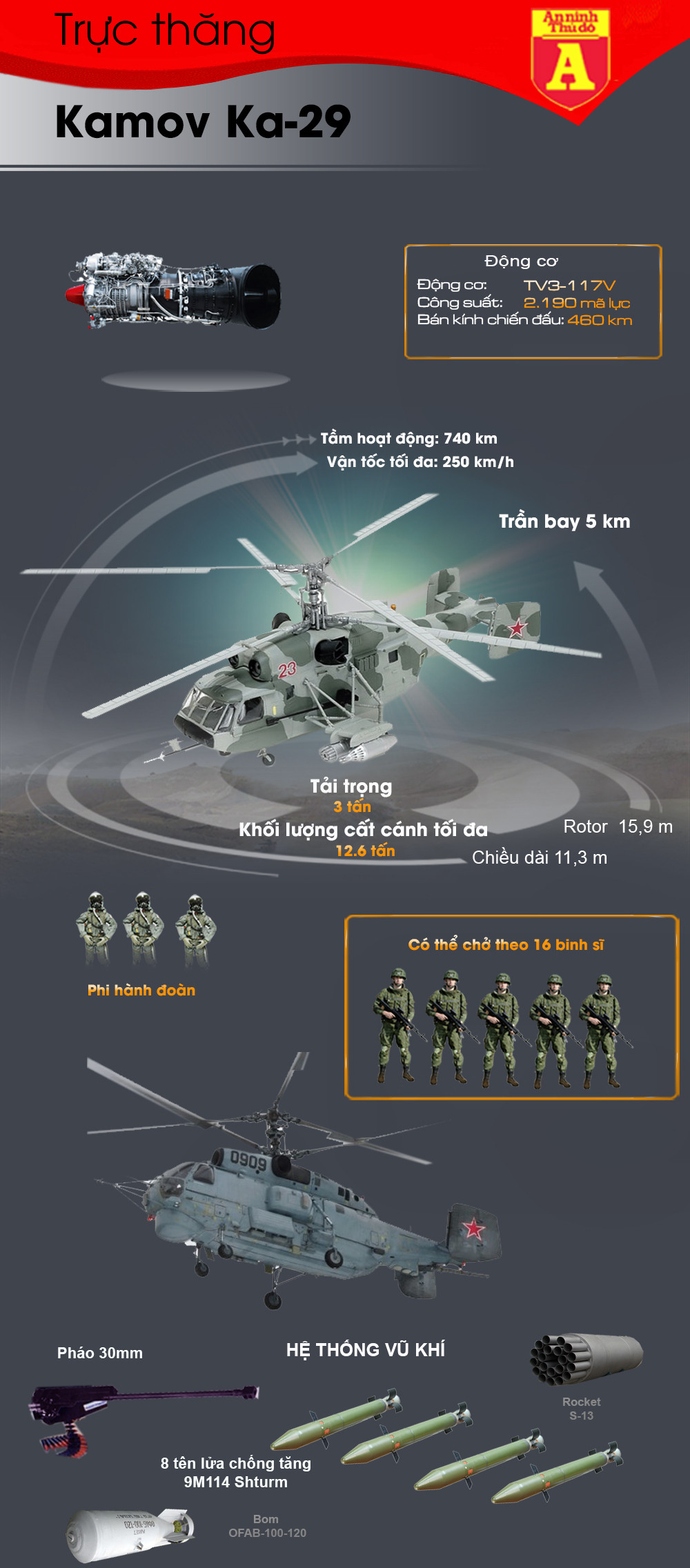 Ngoài nhiệm vụ tấn công, Ka-29 còn có khả năng vận chuyển binh sĩ và trinh sát. Cùng xem thông số chi tiết loại trực thăng đặc biệt này qua infographic dưới đây.