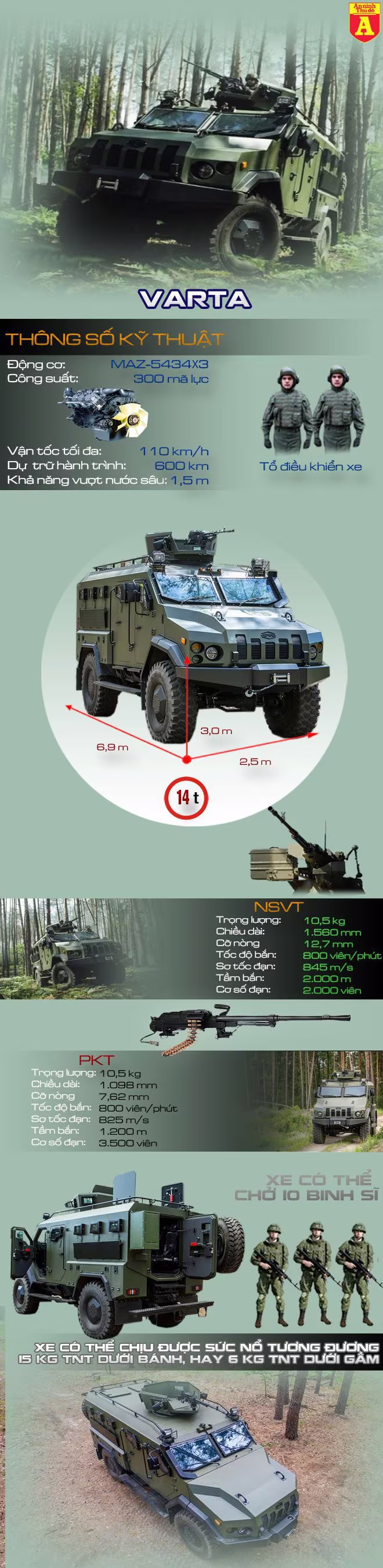 Varta được thiết kế với gầm hình chữ V để phân tán sức công phá của các vụ nổ dưới gầm xe, giúp bảo vệ binh sĩ tốt hơn. Thân xe được bọc thép để có thể chống chọi tốt với các cuộc tấn công bằng vũ khí cá nhân. Với khối động cơ 300 mã lực, Varta có thể chạy với vận tốc lên tới 120km/h.