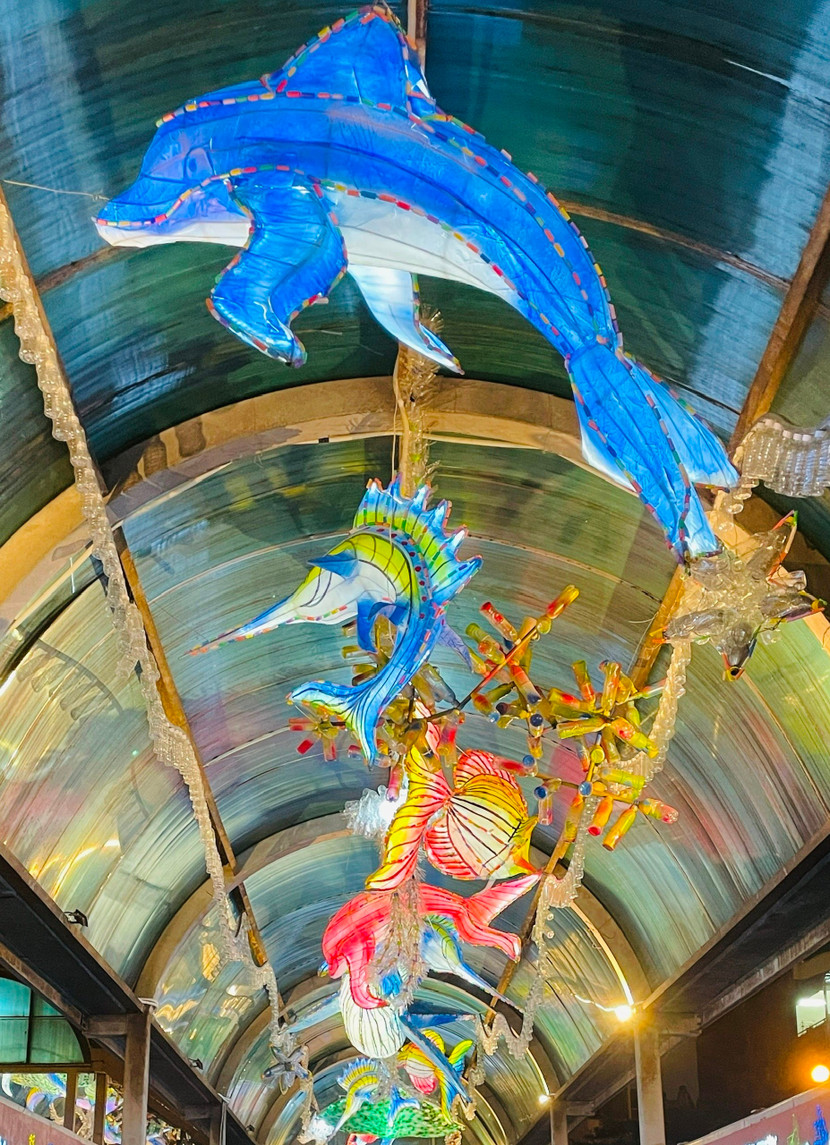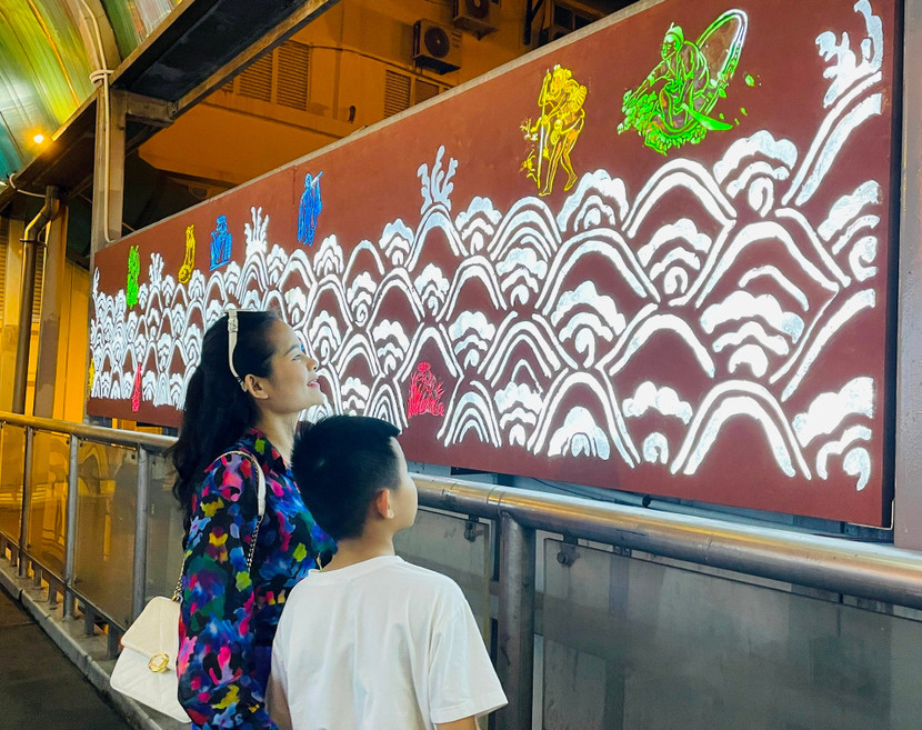 Từ vỏ chai nhựa, cốc nhựa, ống hút nhựa, ni lông tái chế… được thu gom từ khắp nơi trong thành phố, họa sĩ Vũ Xuân Đông sắp đặt tương tác biến cây cầu đi bộ trở thành đường "hầm thủy cung" trên cạn với rất nhiều loài cá đại dương đang bơi lội phía trên vòm cầu. Dọc hành lang thành cầu, tác phẩm sắp đặt ánh sáng với chủ đề “Sóng” của họa sĩ Lê Đăng Ninh gợi lại ký ức của những lớp sóng sông Hồng chuyên chở phù sa suốt chiều dài lịch sử dân tộc.