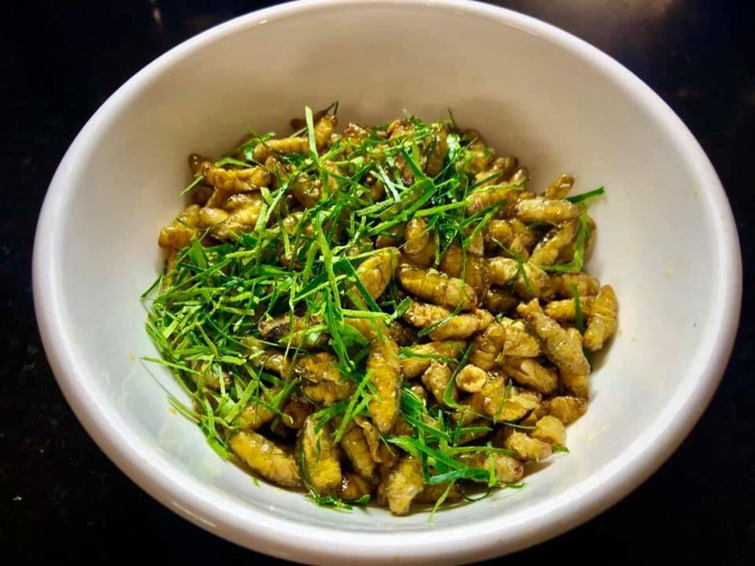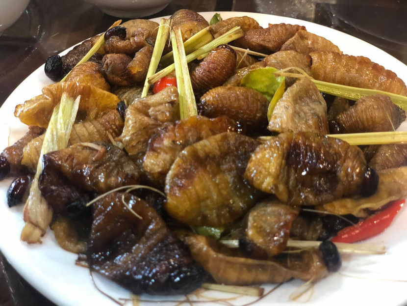Món ăn được phổ cập rộng nhất là nhộng tằm. Trong Y học cổ truyền, nhộng tằm có tên thuốc là Tàm dũng, có vị mặn, ngọt, bùi béo, tính bình, không độc, bổ dưỡng, nhuận tràng. Nhộng được bán nhiều ngoài chợ và có 2 loại. Một là loại đã luộc để lấy tơ và loại kia vẫn còn nguyên trong kén. Để lấy được nhộng, người ta phải cắt cái kén ra và nhộng còn sống nguyên. Loại đã luộc không đắt, nhưng loại nhộng chưa luộc ngoài chợ không bao giờ bán dưới 200 nghìn đồng/kg.