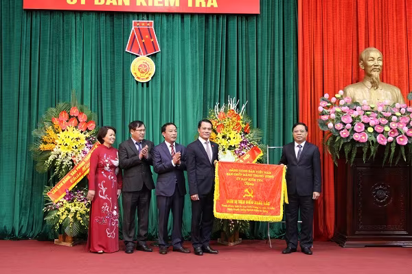 Phó Chủ nhiệm UBKT Trung ương Tô Quang Thu trao Cờ thi đua xuất sắc của UBKT Trung ương cho UBKT Thành ủy Hà Nội