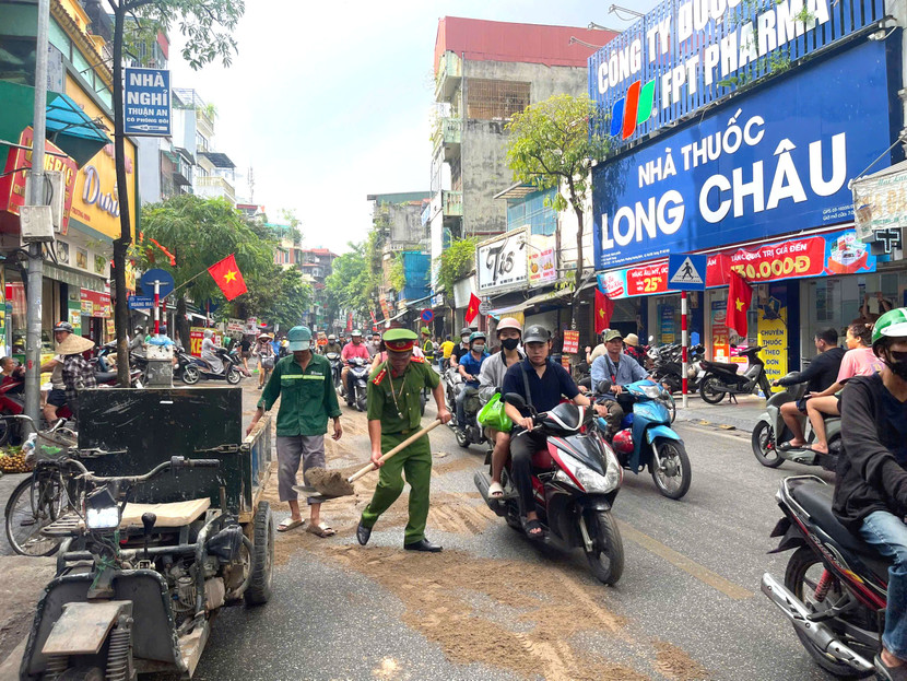 Ngay sau khi nắm được thông tin, Đại úy Nguyễn Hữu Đoàn, Cảnh sát trật tự Công an phường Tương Mai cùng tổ dân phòng đã chủ động đi mua cát, mang đến hiện trường, đổ và quét đều lên mặt đường để thấm dầu, giảm độ trơn trượt. Các anh cũng dùng chổi và nước lau rửa sạch khu vực, đảm bảo người dân có thể lưu thông an toàn.