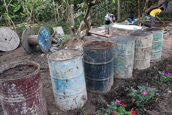 Thay vì diệt cỏ bằng thuốc hóa học, người nông dân phải nhổ cỏ thủ công và đem ủ trong những chiếc thùng phuy cũ để làm phân bón hữu cơ