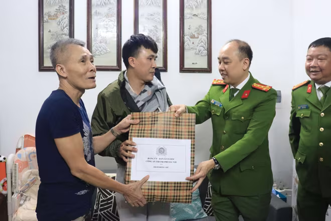 Tại gia đình đồng chí Hoàng Minh Quân, Đại tá Nguyễn Đức Long cùng các thành viên trong đoàn ân cần hỏi thăm tình hình sức khỏe, động viên tinh thần đồng chí Quân và chia sẻ với những khó khăn trong quá trình điều trị, phục hồi. Đồng chí Phó Giám đốc CATP ghi nhận tinh thần trách nhiệm, mưu trí, dũng cảm của đồng chí Quân khi thực hiện nhiệm vụ trong Tổ công tác Y6/141 rạng sáng 15/11.