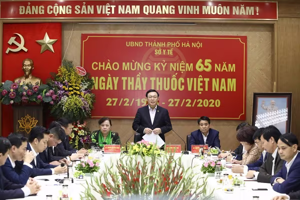 Sáng nay, 27-2, nhân kỷ niệm 65 năm Ngày Thầy thuốc Việt Nam (27/2/1955 - 27/2/2020), Ủy viên Bộ Chính trị, Bí thư Thành ủy Hà Nội Vương Đình Huệ đã đi thăm, chúc mừng cán bộ, y, bác sĩ và kiểm tra công tác phòng, chống dịch Covid-19 tại Bệnh viện Đa khoa Đức Giang. Cùng đi có Chủ tịch UBND TP Nguyễn Đức Chung - Trưởng ban Chỉ đạo công tác phòng, chống dịch bệnh Covid-19 thành phố Hà Nội.