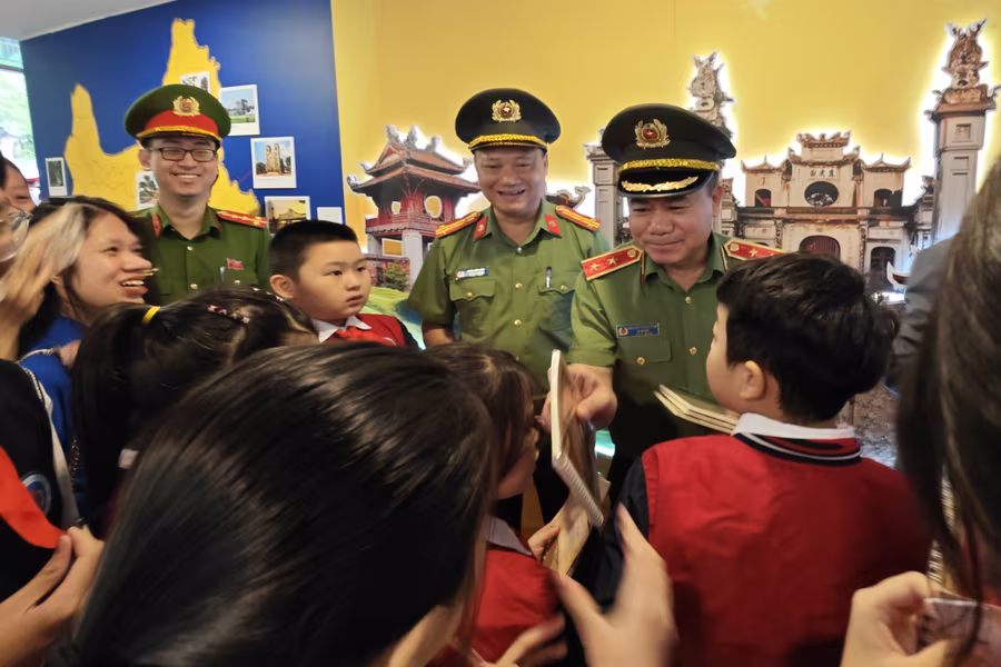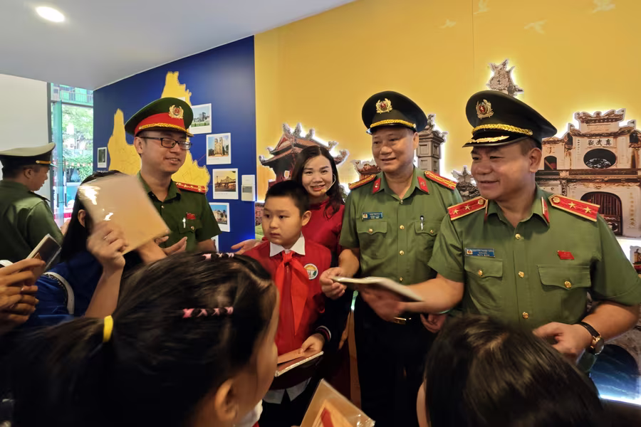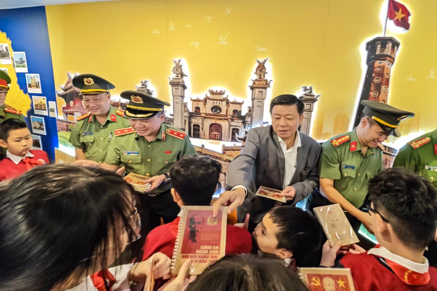 Lãnh đạo UBND TP và Giám đốc CATP Hà Nội tặng quà các em học sinh tham quan Bảo tàng Công an Hà Nội