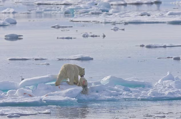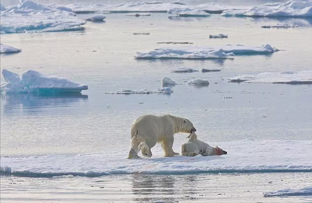 Những con gấu Bắc Cự trưởng thành thường được biết đến hiếm khi ăn thịt đồng loại của mình. Tuy nhiên, ây giờ, các nhà khoa học tin rằng chính do nhiệt độ trái đất đang nóng dần lên khiến cho loài gấu Bắc Cực trở nên đói hơn. Bức ảnh được chụp bởi nhà nhiếp ảnh môi trường Jenny Ross, ở gần quần đảo Norwegian của Na Uy, nơi một cậu bé học sinh có tên Horatio Chapple, 17 tuổi đã bị một chú gấu giết chết vào tháng 8 vừa qua. Jenny Ross khi nhìn từ xa đã nghĩ rằng gấu Bắc Cực đang ăn một con hải cẩu. Tuy nhiên, một cảnh tượng kinh hoàng xảy ra là gấu Bắc Cực đang ăn thịt chính đồng loại của mình. Không có một con gấu khác nào gần đó, điều đáng sợ hơn mà Jenny Ross cho rằng đó chính là mẹ của chú gấu con. Sau khi thấy có người lại gần, chú gấu Bắc Cực trưởng thành đã dùng mồm ngoạm con mồi ra một chỗ khác xa hơn và tiếp tục ăn thịt.