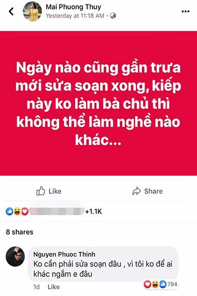 Dòng trạng thái của Hoa hậu Việt Nam 2006 được đăng tải ngày 5/5 với nội dung “Ngày nào cũng gần trưa mới sửa soạn xong, kiếp này không làm bà chủ thì không thể nào làm nghề khác”.