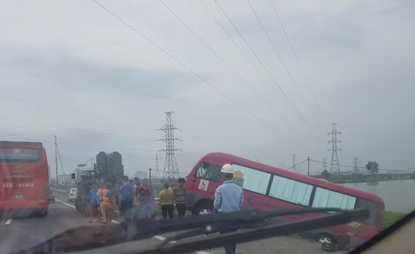 Vào thời điểm trên, khi chiếc xe đang lưu thông đến đầu quốc lộ, bất ngờ mất lái, hất tung dải ta luy rồi lao xuống ven đường. Chiếc xe bị quay ngang, đuôi xe chỉ cách hồ nước gần đó vài mét. Sự cố xảy ra đã khiến hàng chục hàng khách hoảng sợ, tuy nhiên may mắn không có ai bị thương.