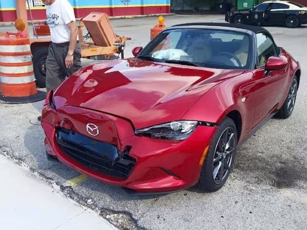 Tuy nhiên, sau khi ra khỏi đại lý, chiếc Mazda MX-5 mới toanh bất ngờ bị xe bán tải cỡ lớn Ford F-150 húc vào đuôi và khiến nó lao về phía trước, đâm tiếp vào một xe khác.