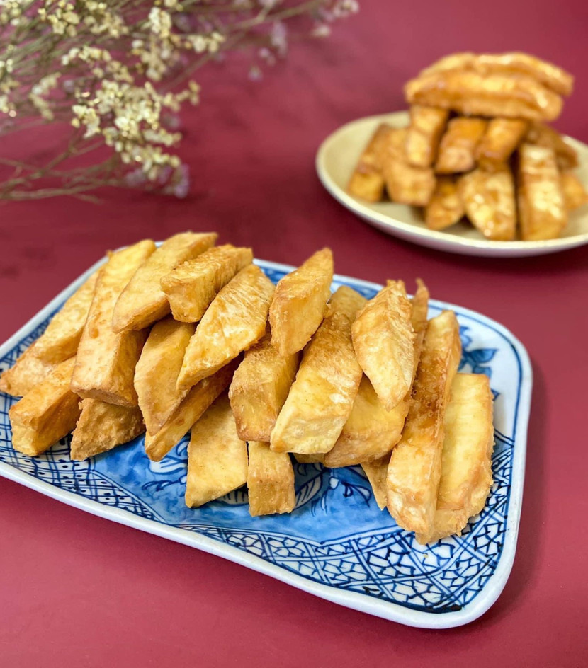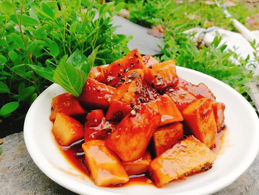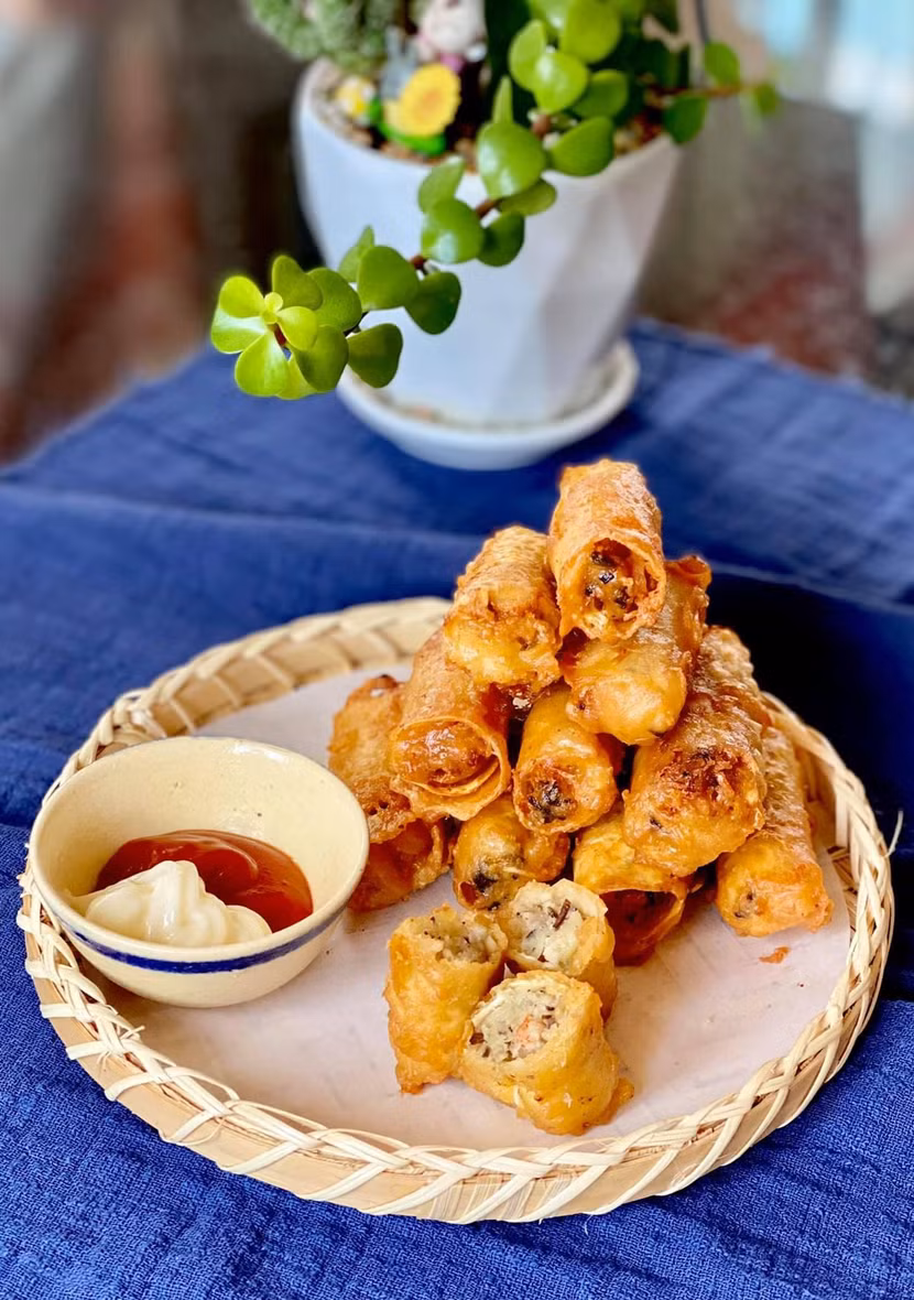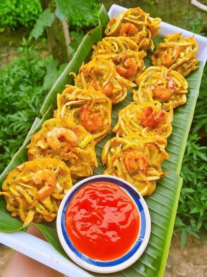 Sa kê thái sợi nhỏ, tẩm bột rồi thêm tôm, mực, hoặc bất cứ loại nhân nào tùy độ sáng tạo, đem chiên giống như chiên bánh tôm Hồ Tây. Thành phẩm ăn có vị giòn, ngọt và béo, rất hấp dẫn.