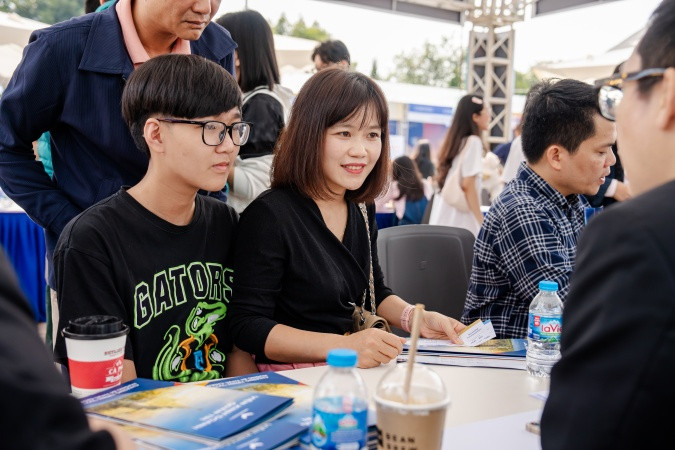 Gian hàng Tuyển sinh luôn nườm nượp người tham dự với mô hình tư vấn hướng nghiệp 1:1 giải đáp mọi thắc mắc cho phụ huynh, học sinh về chương trình tuyển sinh vào trường và các ngành học.