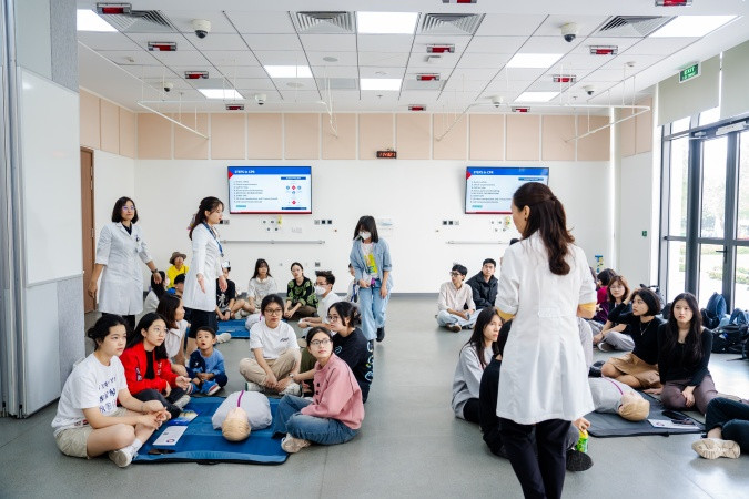 Lớp học về Xử lý sơ cấp cứu và Giải phẫu cơ thể thu hút sự quan tâm của nhiều học sinh với bài học thực hành trực quan và sinh động. VinUni là trường đại học đầu tiên của Việt Nam và thứ hai Đông Nam Á đạt kiểm định chất lượng quốc tế ACGME-I, trang bị rất nhiều cơ sở vật chất tối tân phục vụ các ngành học thuộc Viện Khoa học sức khoẻ.