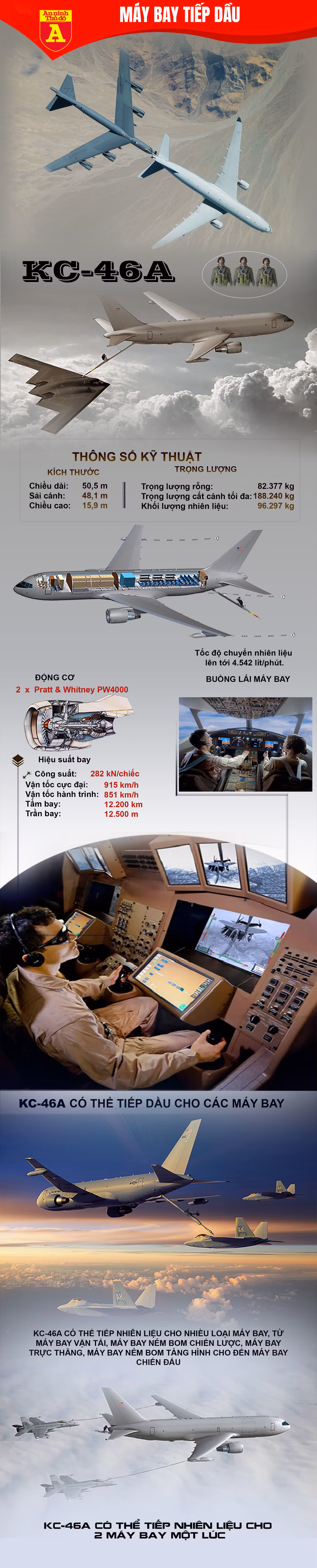 KC-46A Pegasus sức chở 96 tấn nhiên liệu, có thể tiếp cho tất cả các máy bay cánh cố định dựa trên hệ thống tiếp liệu được sử dụng trên KC-10, với dung lượng lên tới 4.542 lít/phút. Hệ thống điều khiển tiếp liệu bằng cần điều khiển và theo dõi trên màn hình 3D 24 inch hiển thị dữ liệu từ hệ thống camera. Có thể nói đây chính là máy bay tiếp dầu hiện đại nhất thế giới hiện nay.