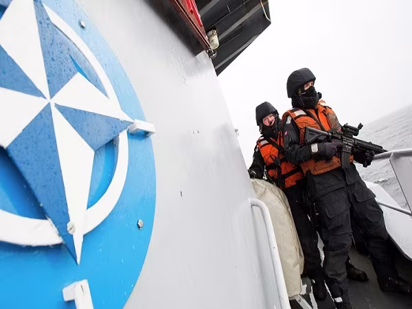 Lính Na Uy trên tàu hộ tống Valkyrien mang biểu tượng của NATO