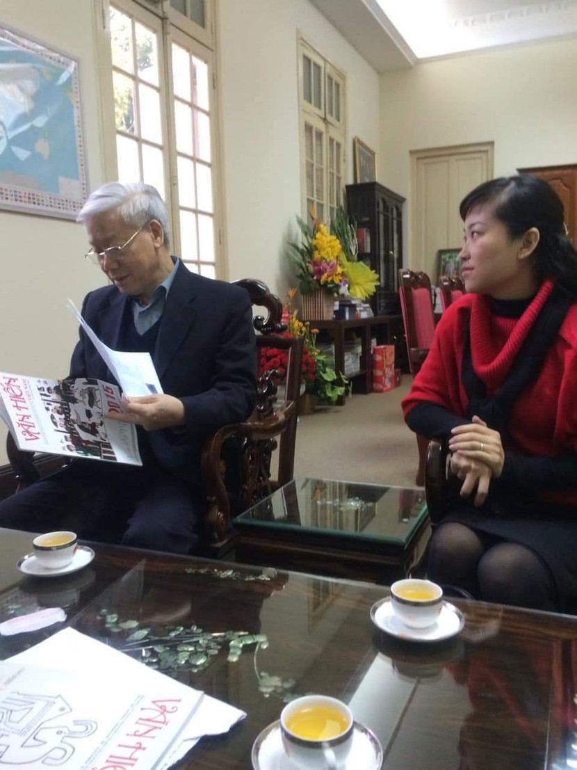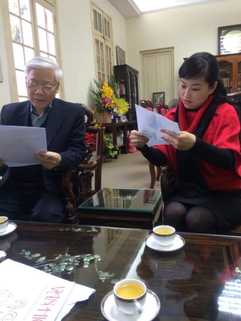 | Nghệ sĩ Mai Tuyết Hoa cùng GS Hoàng Chương - bạn học của đồng chí Tổng Bí thư Nguyễn Phú Trọng - đến thăm và chúc Tết đồng chí Tổng Bí thư nhân dịp đầu Xuân mới. |