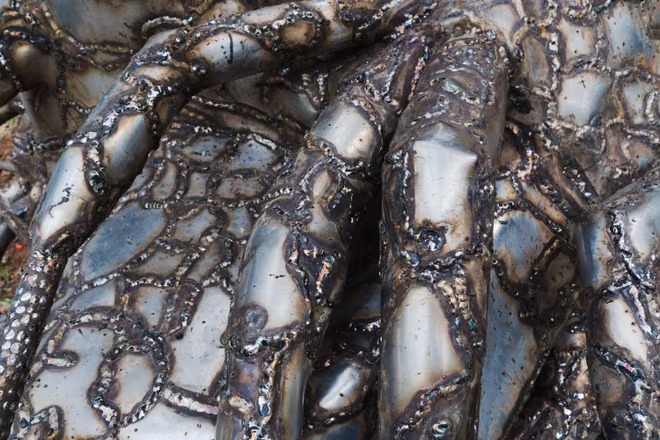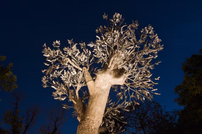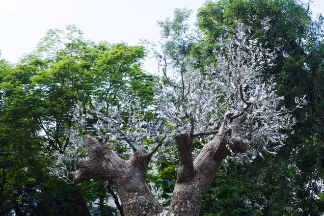 Sau khi cắt gọt toàn bộ thân và rễ cây, phần thân cây được nữ nghệ sĩ ốp bằng những tấm inox dày, gò thủ công. Công đoạn này vô cùng tỉ mỉ để những miếng thép ôm sát vào từng đường cong gồ ghề của thân cây. Các mối nối được hàn kín, tạo thành những nốt và rãnh xù xì như lớp vỏ cây trước đây. Cành cây được mô phỏng những đường nét khúc khuỷu, tự nhiên. Tán lá được tạo nên từ hàng nghìn chiếc lá thép óng ánh, điểm xuyết bởi những “bông hoa” thạch anh lấp lánh đủ sắc màu.