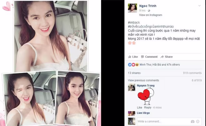 Mới đây trên tài khoản Instagram và trang Facebook cá nhân, Ngọc Trinh đã đăng tải những dòng chia sẻ và hình ảnh đầu tiên kể từ sau cuộc tình ồn ào và ngắn ngủi với tỷ phú Hoàng Kiều. Kèm theo những bức ảnh “selfie” rạng rỡ, Ngọc Trinh cho biết cuối cùng thì cô cũng bước qua một năm không may mắn và mong năm mới 2017 sẽ là một năm tốt đẹp về mọi mặt với mình.