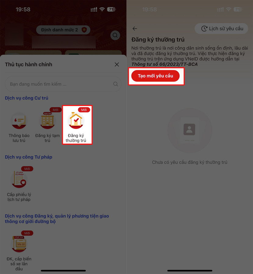 Bước 2: Chọn thủ tục Đăng ký thường trú > Nhấn Tạo mới yêu cầu để thực hiện