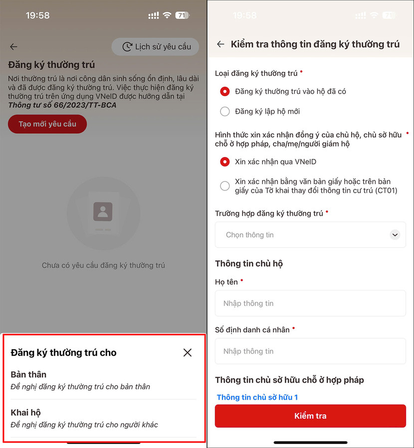Bước 3: Chọn mục đích tạo mới Bản thân/Khai hộ > Điền thông tin để hoàn tất quá trình.