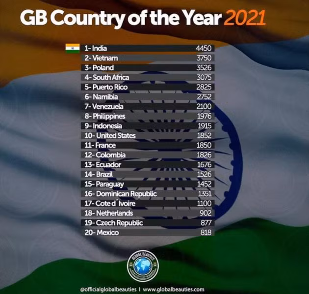 Được biết, kết quả trên được các chuyên gia sắc đẹp của chuyên trang Globalbeauties công bố dựa trên việc đánh giá, chấm điểm thành tích mà đại diện nhan sắc các quốc gia lập được khi tham gia tranh tài tại 5 đấu trường sắc đẹp lớn trên thế giới gồm: Hoa hậu Thế giới, Hoa hậu Hoàn vũ, Hoa hậu Quốc tế, Hoa hậu Hòa binh quốc tế, Hoa hậu Siêu quốc gia. Dựa trên việc thống kê số liệu và thành tích có được tính đến thời điểm tháng 6-2022, nhan sắc Ấn Độ xếp đầu bảng với 4.450 điểm, nhan sắc Việt đạt 3.750 điểm.