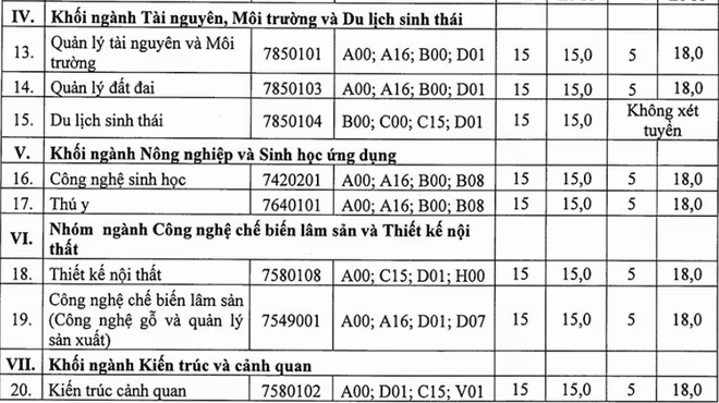 Trường ĐH Lâm nghiệp tuyển bổ sung ở 20 ngành đào tạo tại cơ sở Hà Nội. Điểm nhận hồ sơ xét tuyển nguyện vọng bổ sung là 15 với phương thức xét điểm thi tốt nghiệp THPT và 18 với xét tuyển học bạ. Thời gian trường xét tuyển từ 16/9 đến 2/10. Thời gian công bố trúng tuyển tuyển trước ngày 3/10.