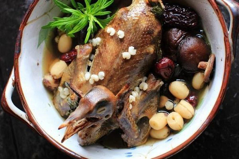 Cùng với đó là chim bồ câu hầm, đây là món ăn bổ dưỡng dành cho người cần cải thiện các vấn đề về sức khỏe. Chim bồ câu thường được hầm cùng hạt sen, đẳng sâm và kỳ tử, táo tàu. Cũng có thể hầm cùng nấm hương, hạt sen, bên trong bụng bồ câu nhồi thêm thịt lợn vai băm nhỏ cùng nấm hương.