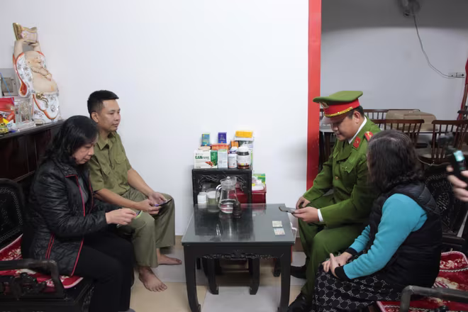 Đến 20h45, Tổ công tác tạm chia một nhóm rời quán cà phê. Họ đi vào sâu hơn trong ngõ nhỏ, đến nhà bà Hoàng Thị Nga, 72 tuổi. Bà bị đau mắt, gần như không nhìn rõ màn hình điện thoại. Đại úy Vũ Hoàng nhẹ nhàng giải thích từng bước.