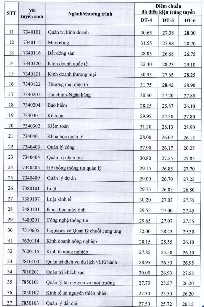 Trường ĐH Thương mại thông báo điểm chuẩn đủ điều kiện trúng tuyển đại học chính quy năm 2022 theo các phương thức xét tuyển 200, 402, 409, 410, 500 như sau: