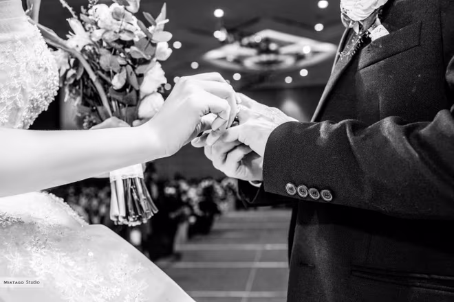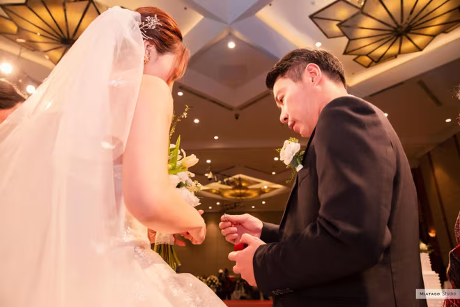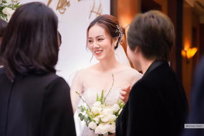 Xuất hiện trên sân khấu để thực hiện các nghi thức của đám cưới, NSND Công Lý không ngần ngại trao tặng người bạn đời của mình nụ hôn đánh dấu ngày cả hai chính thức thành vợ thành chồng. Nam nghệ sĩ không giấu được sự xúc động khi nhận được tình cảm và chúc phúc từ đông đảo mọi người.