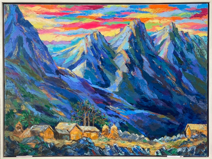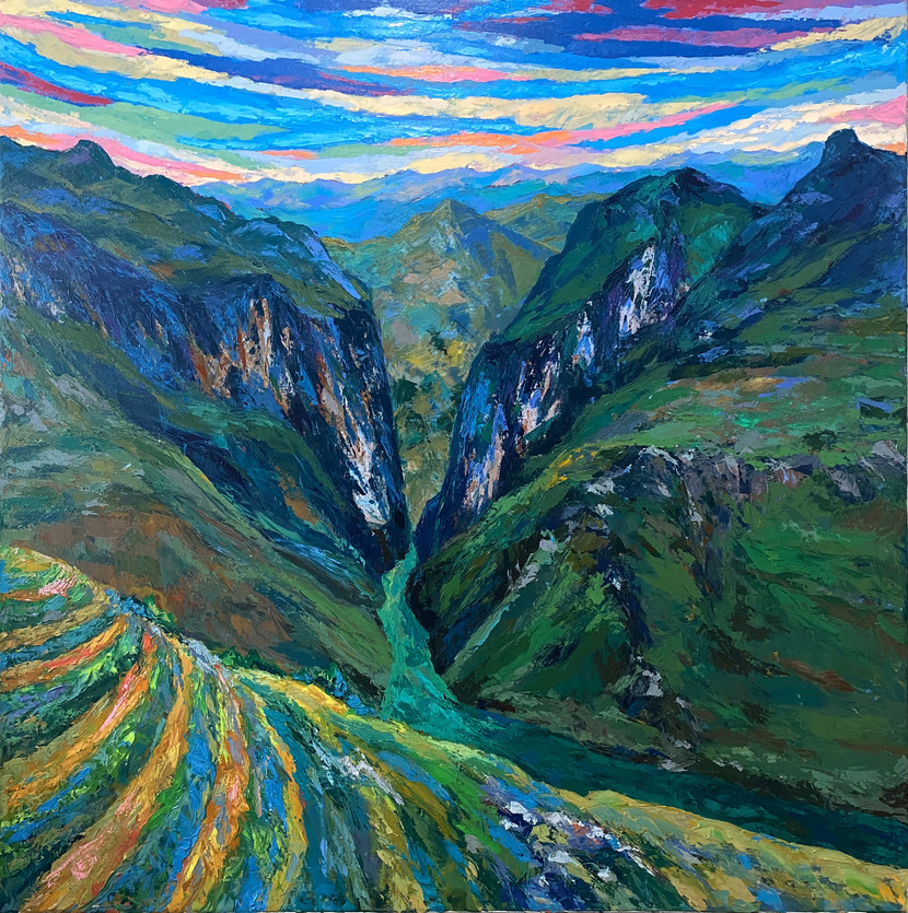 So với loạt tranh phong cảnh núi rừng góp mặt tại triển lãm “Sắc Hạ” năm 2022, năm này, anh tham gia triển lãm “Sắc Hạ 2” về cơ bản có một số điểm mới hơn 1 chút. Đó là ngoài phong cách vẽ màu ấn tượng về rừng núi Tây Băc, Thanh Dương có vẽ thêm về một số phong cảnh khác như bức “Thiên Trúc Tự” vẽ về không gian mênh mông cõi Phật chùa Đồng Yên Tử.