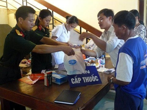 | Các y, bác sĩ tiến hành khám chữa bệnh, và phát thuốc cho người dân. |