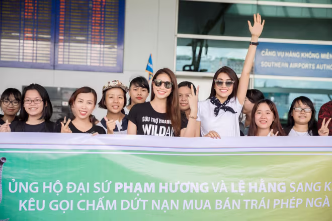 Đông đảo người hâm mộ đã có mặt từ rất sớm để tiễn thần tượng của mình sang Kenya cũng như gửi những lời chúc thành công đến chuyến đi của Phạm Hương và Lệ Hằng. Đáp lại sự nồng nhiệt, hai người đẹp đã vui vẻ chụp hình cùng người hâm mộ bên các băng rôn có khẩu hiệu kêu gọi bảo vệ loài voi.