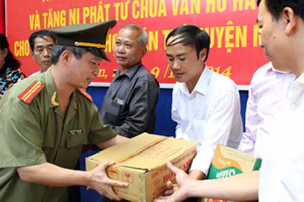 (Trong ảnh: Thiếu tá Nguyễn Thanh Bình, Phó Tổng biên tập Báo ANTĐ tặng quà thầy trò trường bán trú Mai Sơn, Sơn La)